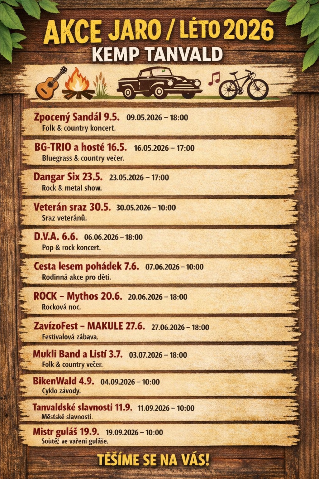 Rádi Vám poradíme s výlety do okolí, včetně tipů na zajímavá místa a akce přímo v kempu nebo blízkém okolí.